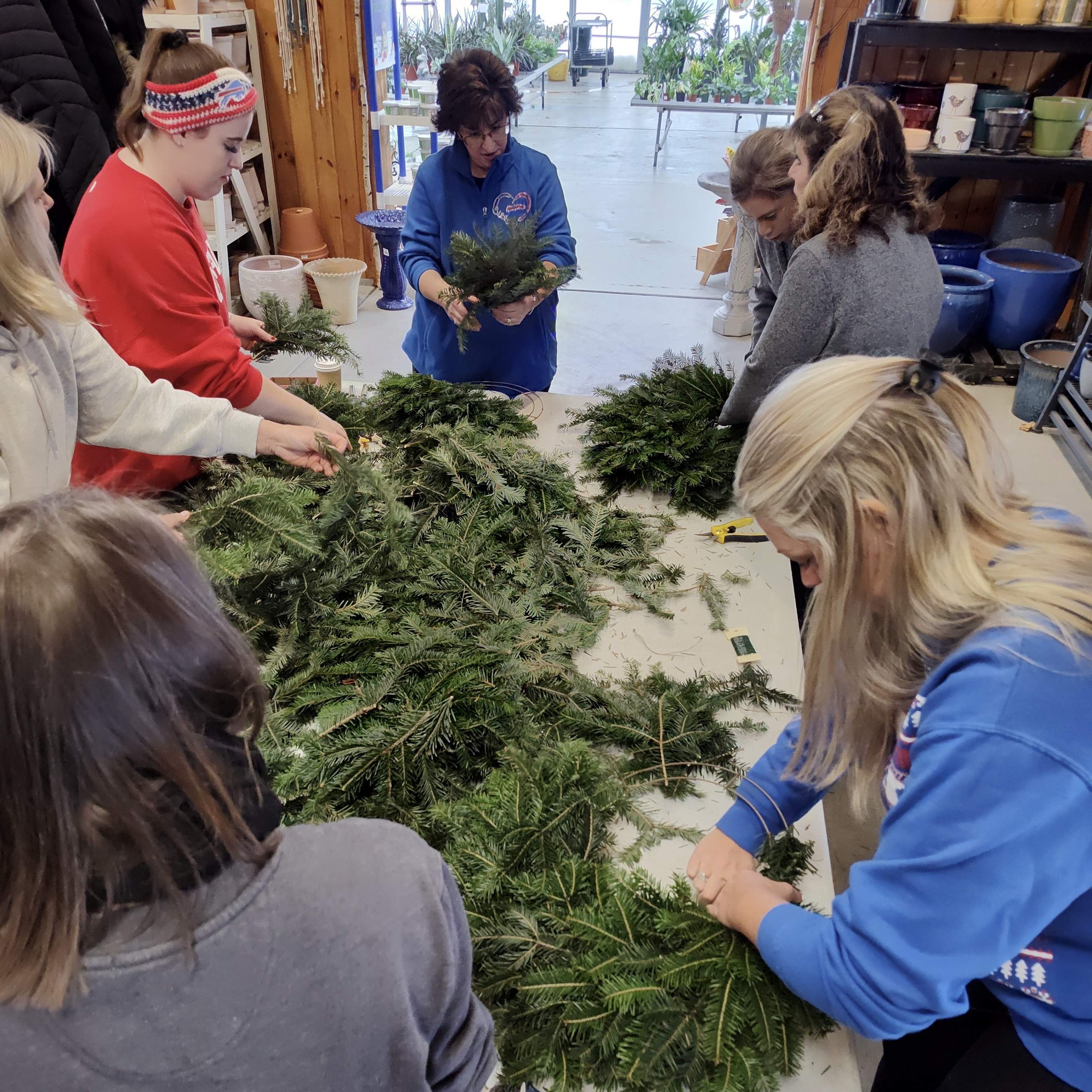 Learn how to make an evergreen wreath and decorate with pinecones, ornaments, berries, and a bow (red or plaid). The base of the wreath is a 14" metal frame. Enjoy a hot beverage while you make your wreath.
